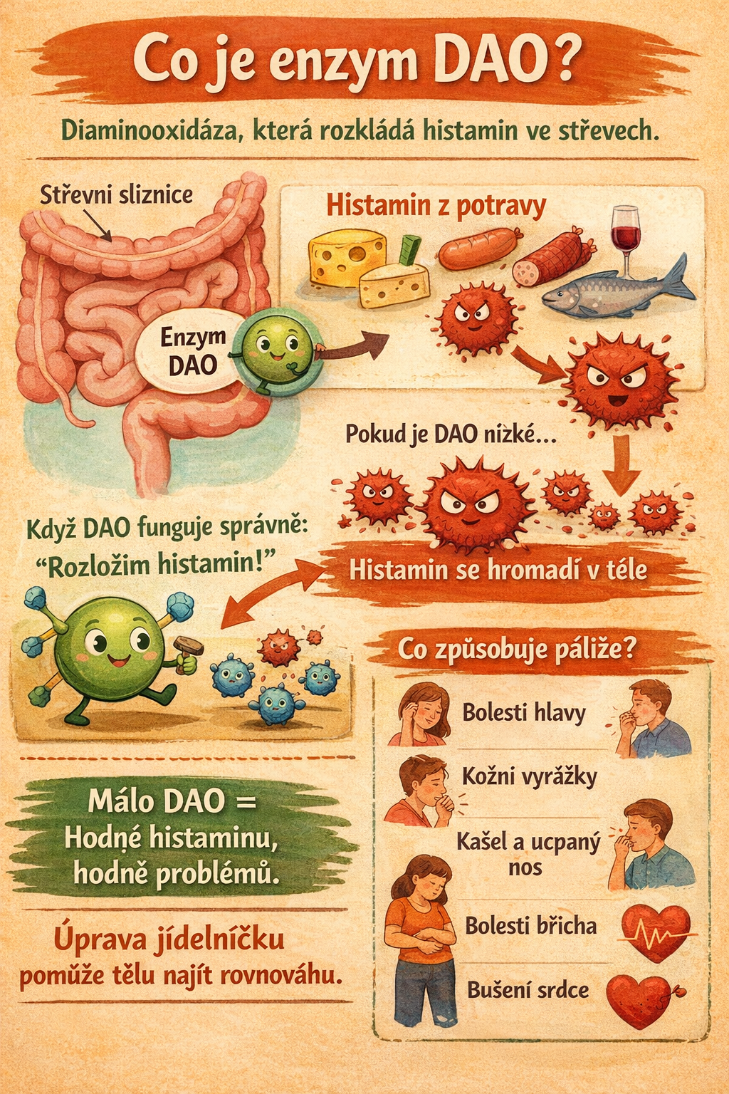 Pokud ale tělo produkuje málo enzymu DAO, histamin se začne hromadit. A to může způsobit různé potíže.