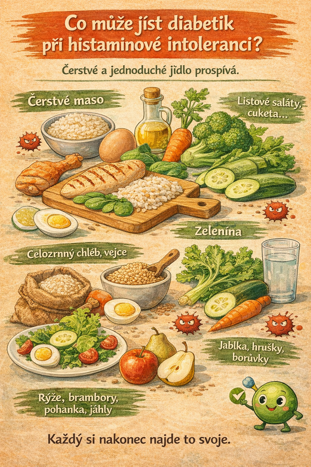 Když se spojí cukrovka a histaminová intolerance, může mít člověk pocit, že už skoro neví, co vlastně jíst. Jedna nemoc říká "hlídej cukry", druhá "pozor na histamin". Ale když se na to podíváme blíž, zjistíme, že existuje docela dost jídel, která mohou vyhovovat oběma.