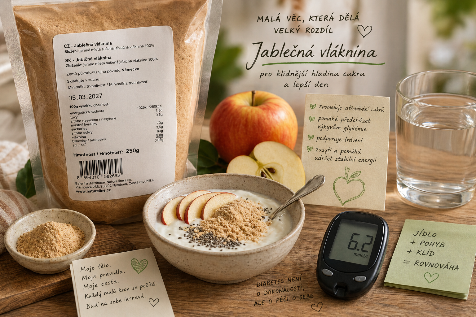 Pamatuju si, jak jsem ji poprvé vzala do ruky. Říkala jsem si, že to je prostě nějaký prášek z jablek, nic víc. Jenže pak mi došlo, že to není o chuti ani o tom, že si tím "něco přidám do jídla". Je to o tom, co to udělá uvnitř těla. Jablečná vláknina totiž zpomaluje vstřebávání cukrů, a to je přesně to, co my diabetici potřebujeme. Žádné prudké výkyvy, žádné horské dráhy, ale hezky pomalu a klidně.