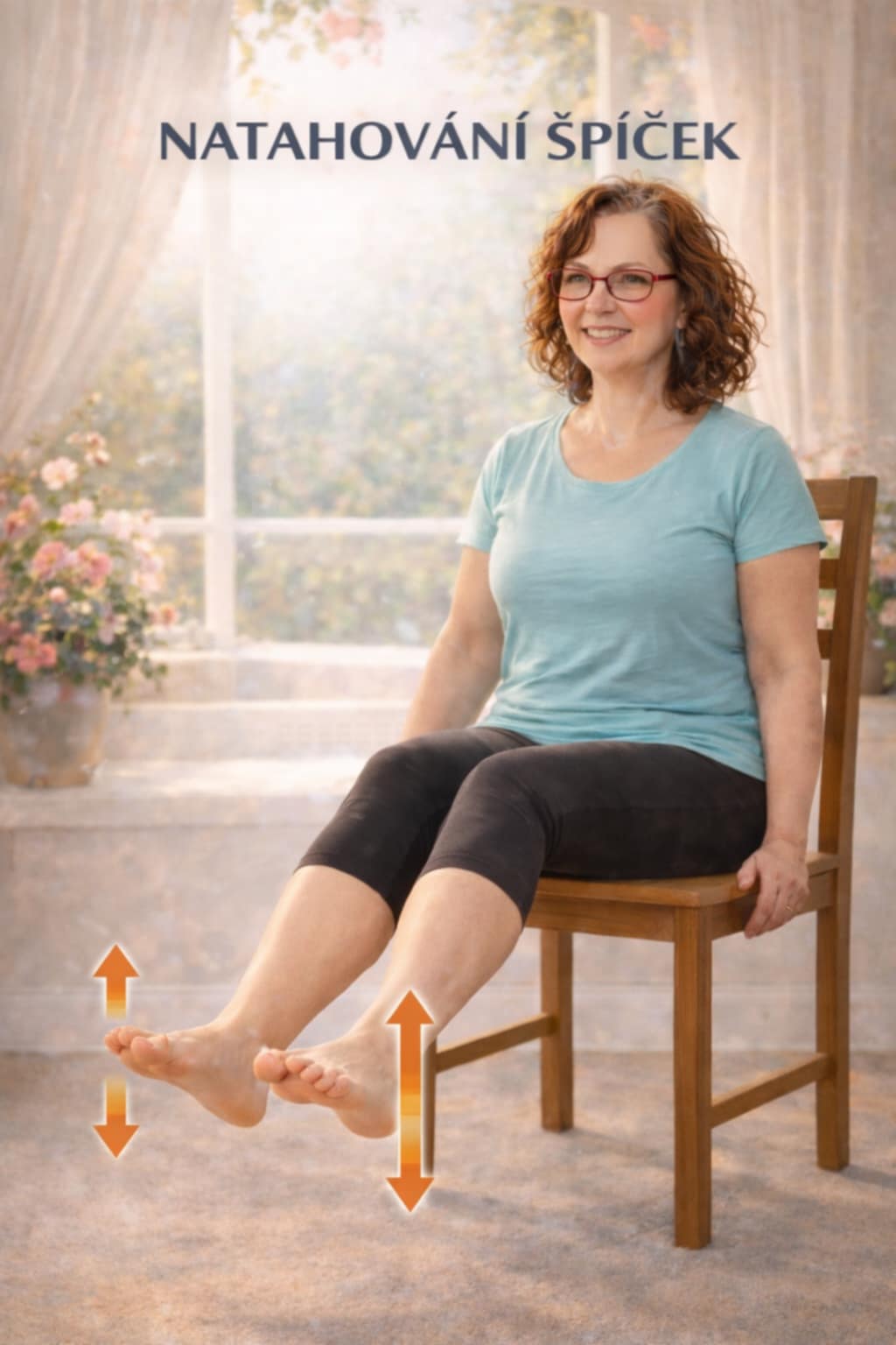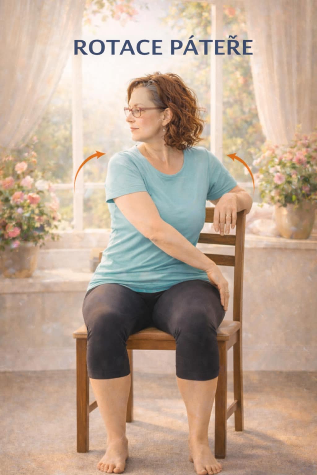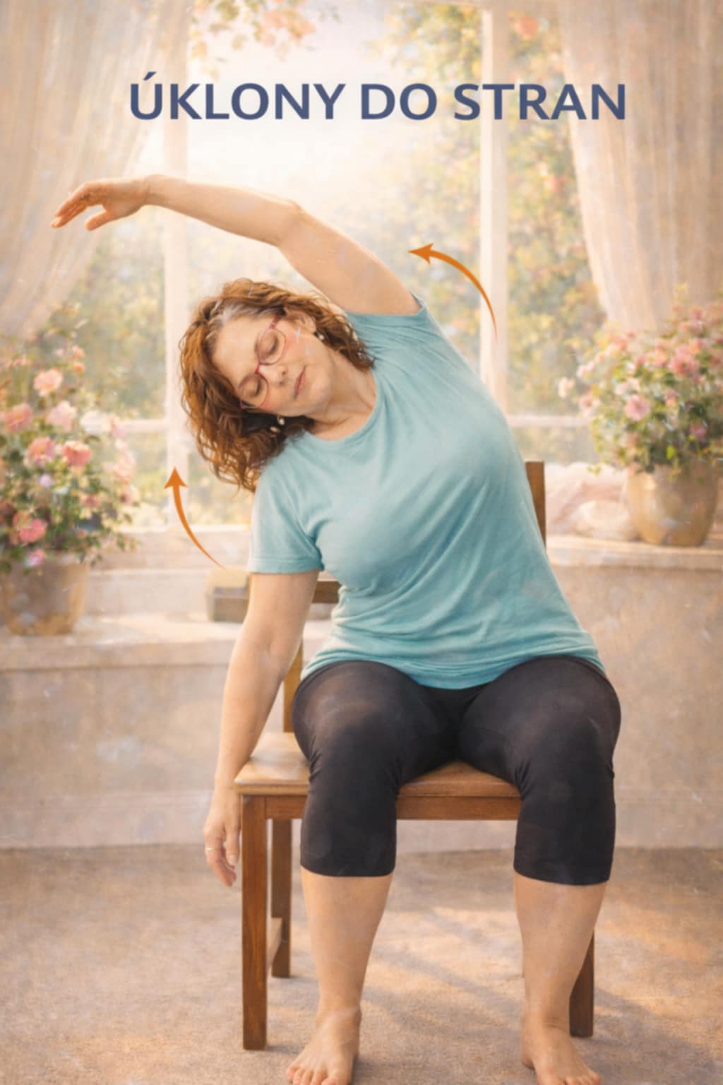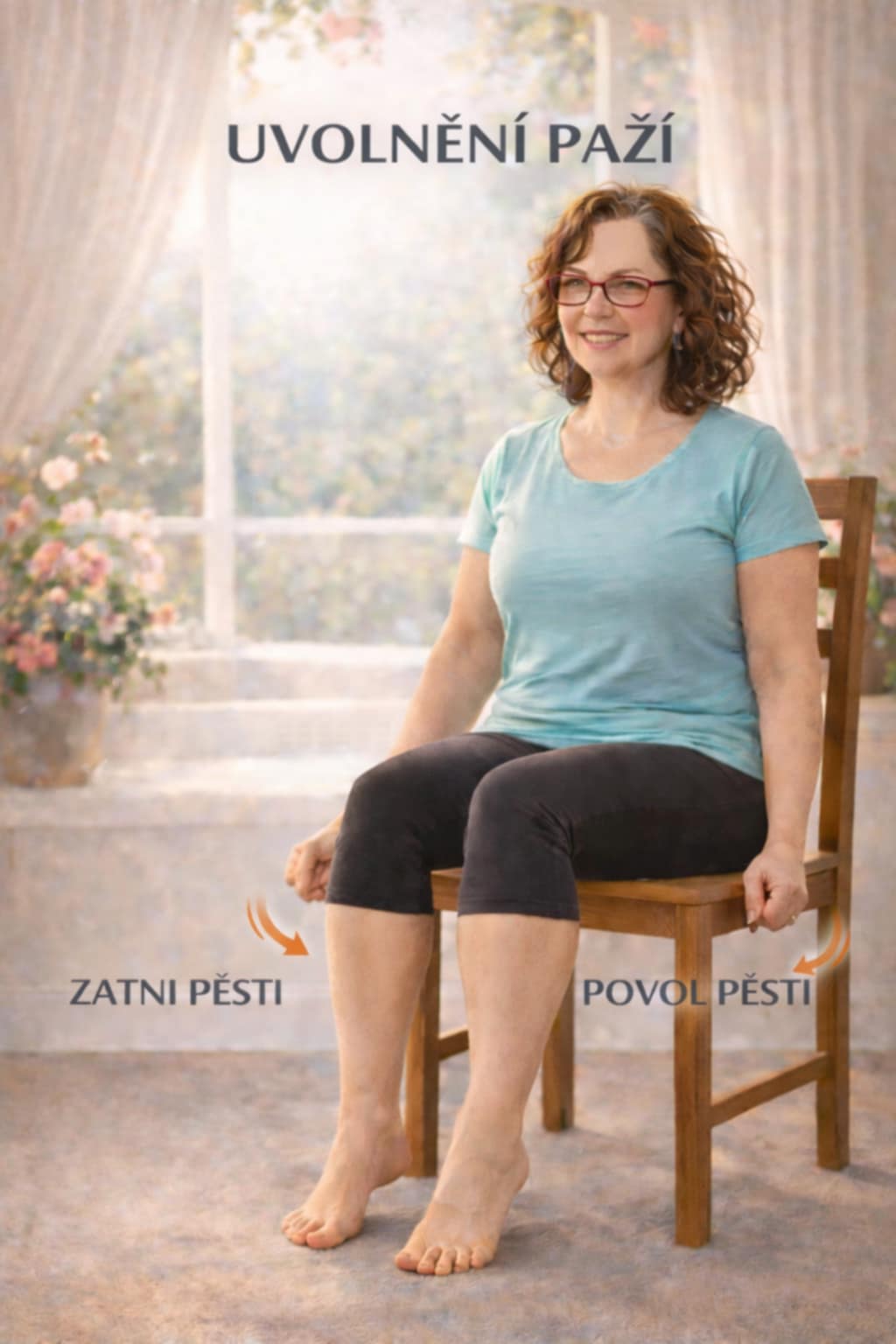 Cvič pomalu, nikdy přes bolest, dýchej klidně nosem, při závrati přestaň, opři se celými chodidly o zem, seď rovně, ale uvolněně...