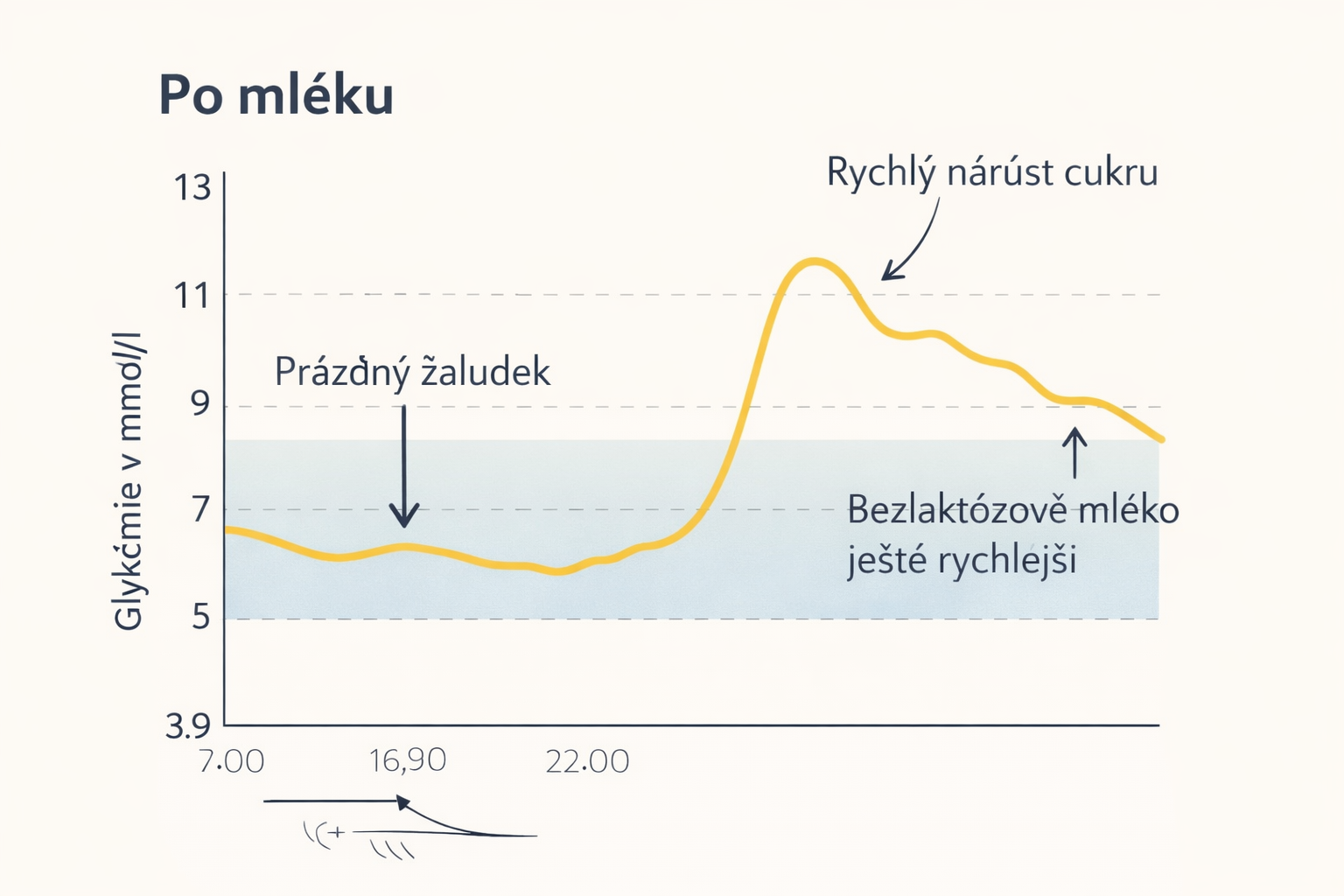 U mě to senzor ukázal jasně. Rychlý vzestup. Protože tekuté sacharidy se vstřebávají rychle. Takže i když je to "jen mléko", tělo to čte jinak.