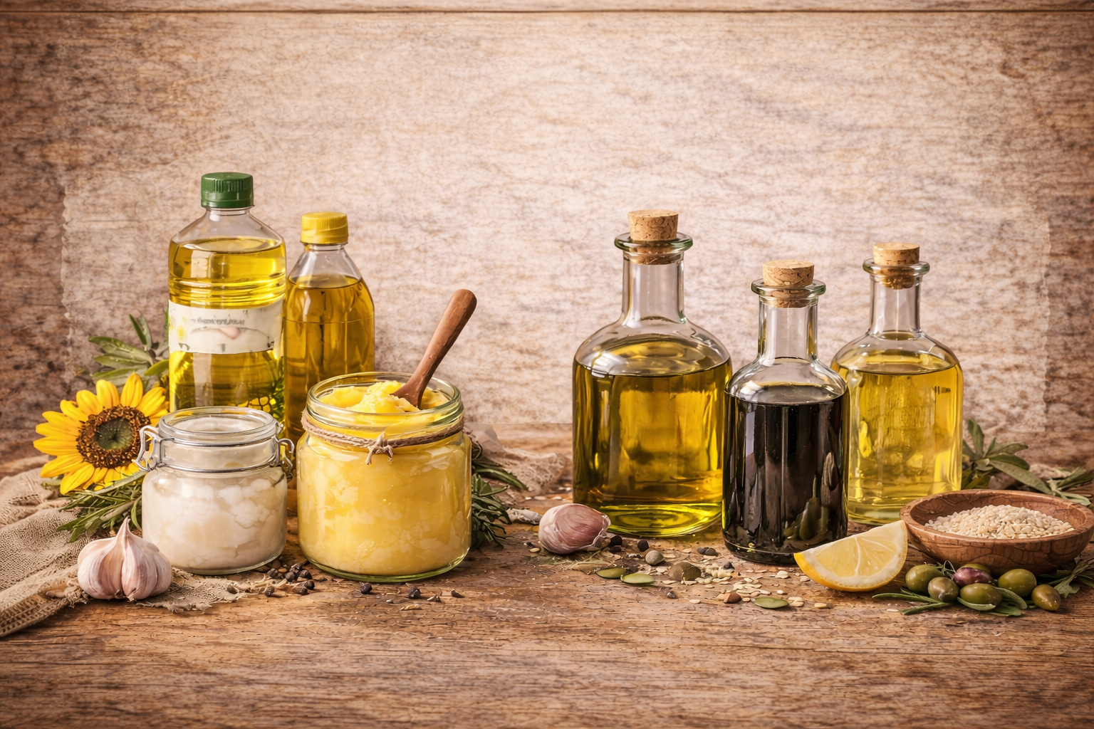 ⚖️ Ghí, máslo, sádlo – stabilní na teplo, ale obsahují víc nasycených tuků